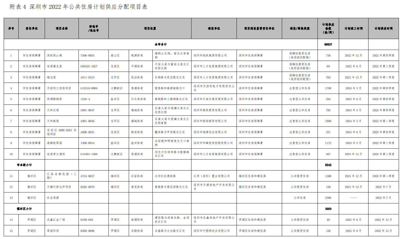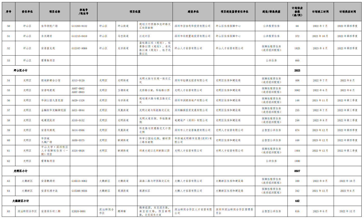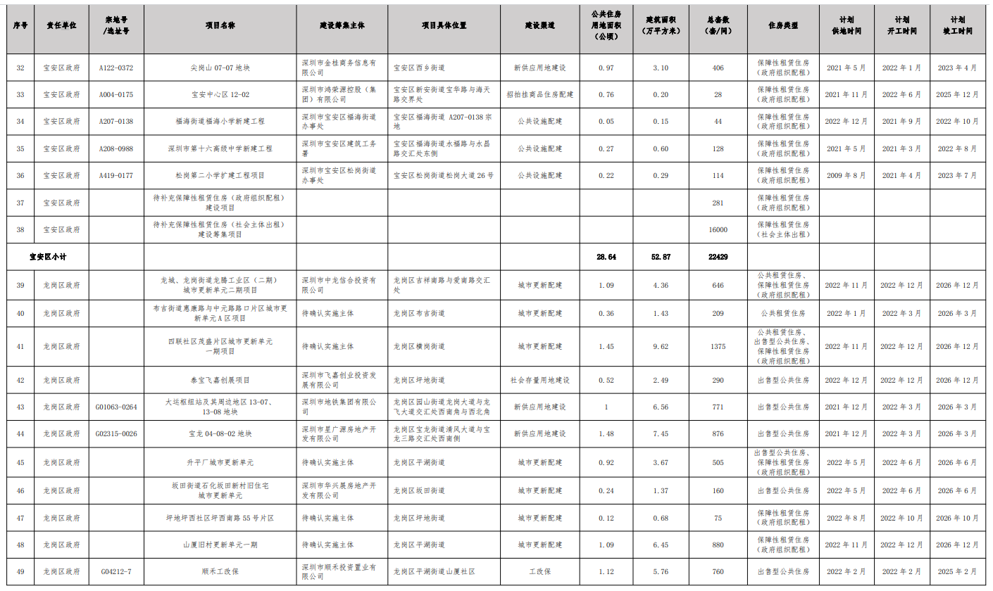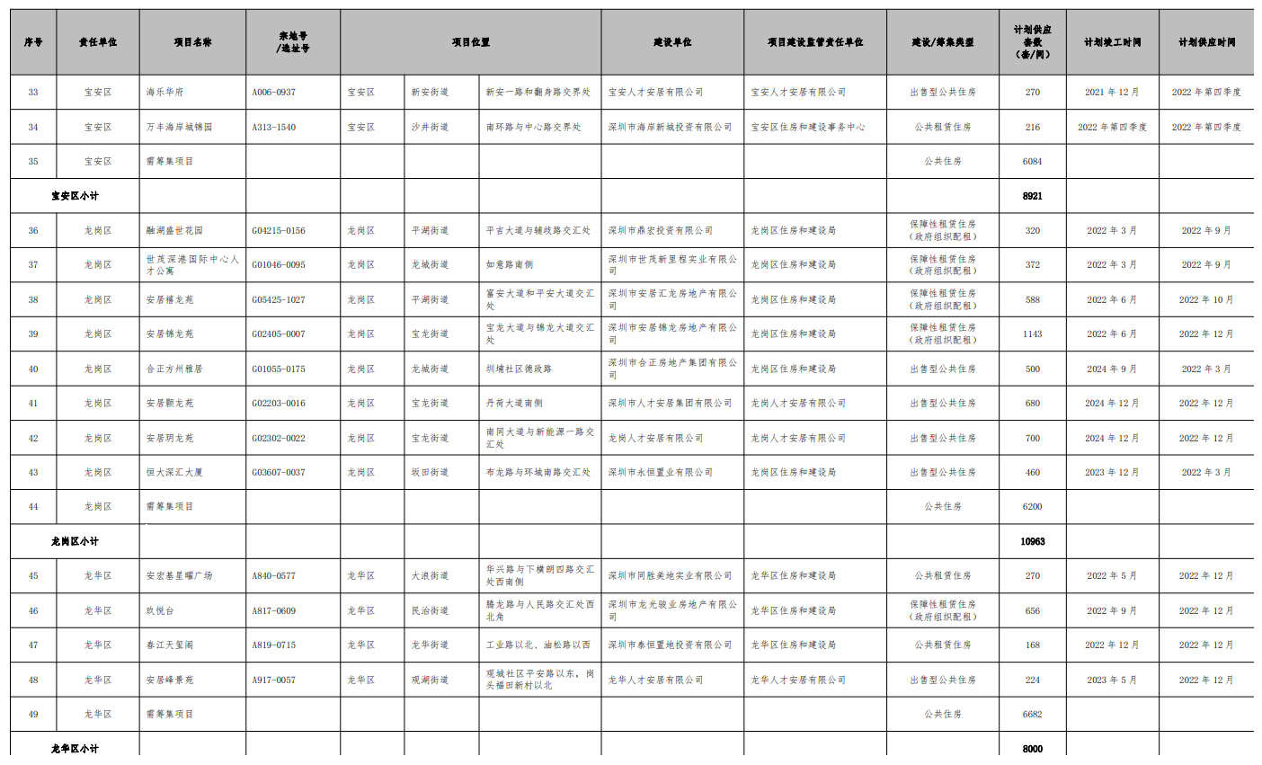 深圳市 2022 年公共住房計劃建設(shè)籌集(含竣工)項目表(截圖)