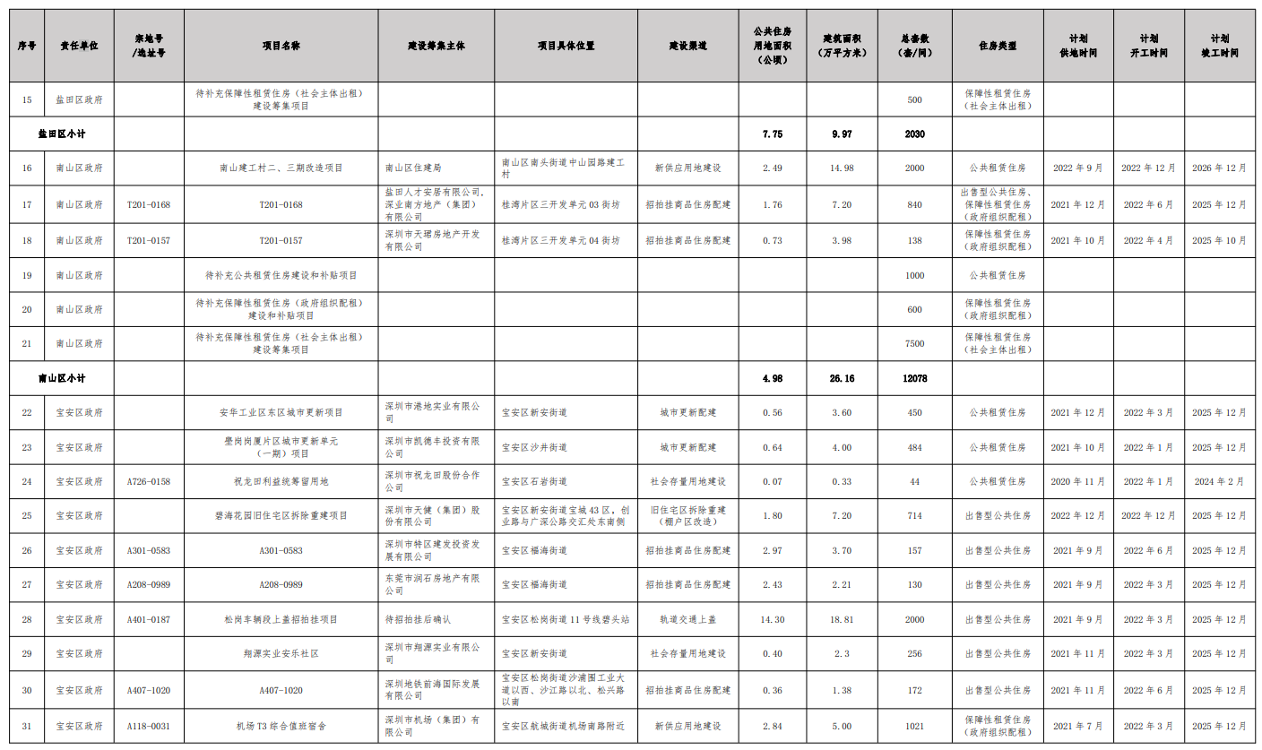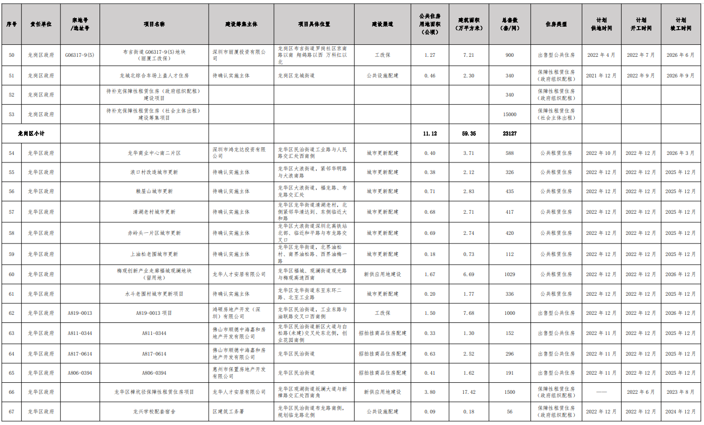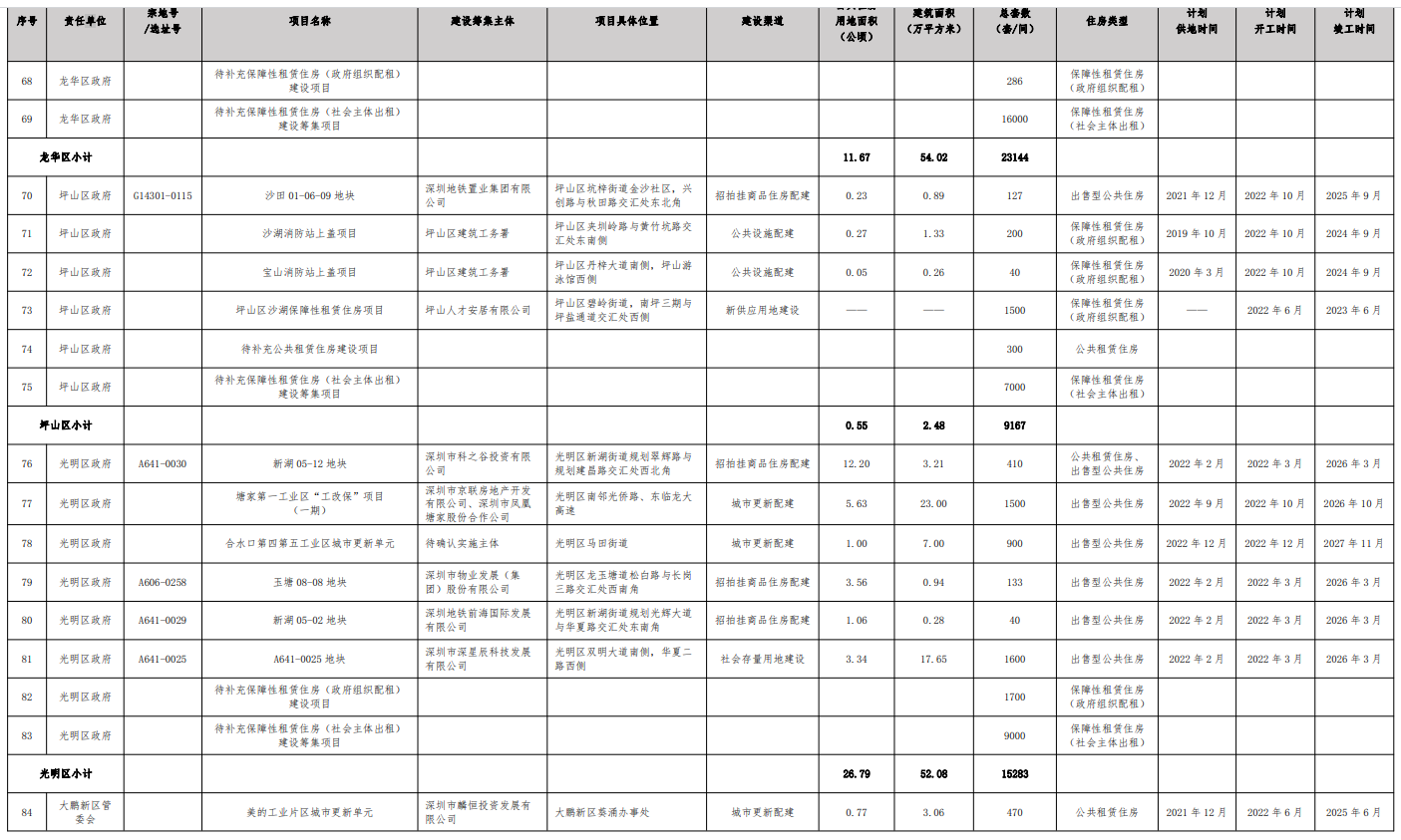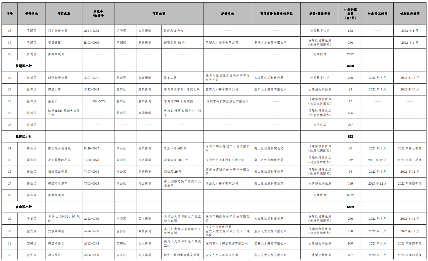 深圳市 2022 年公共住房計劃建設(shè)籌集(含竣工)項目表(截圖)