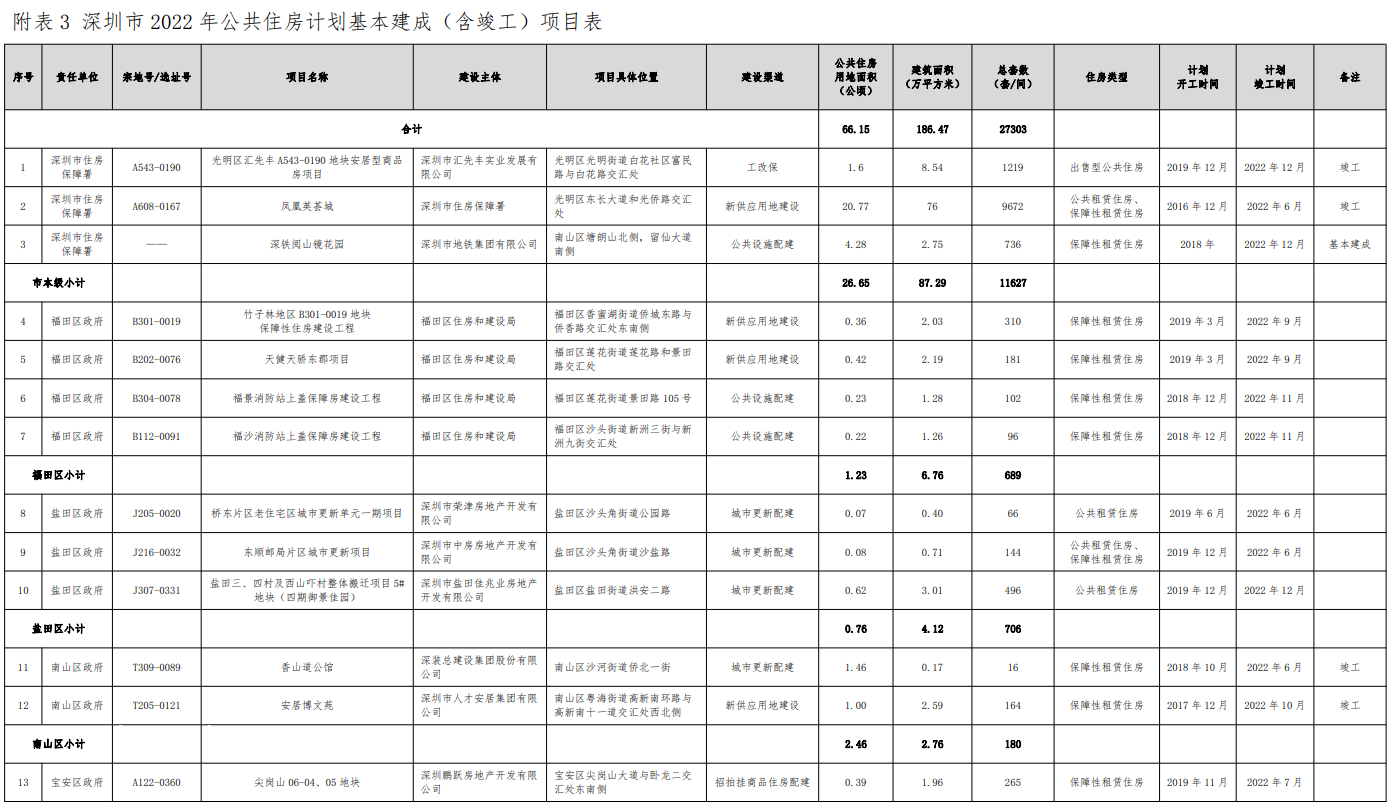 深圳市 2022 年公共住房計劃基本建成(含竣工)項目表(截圖)