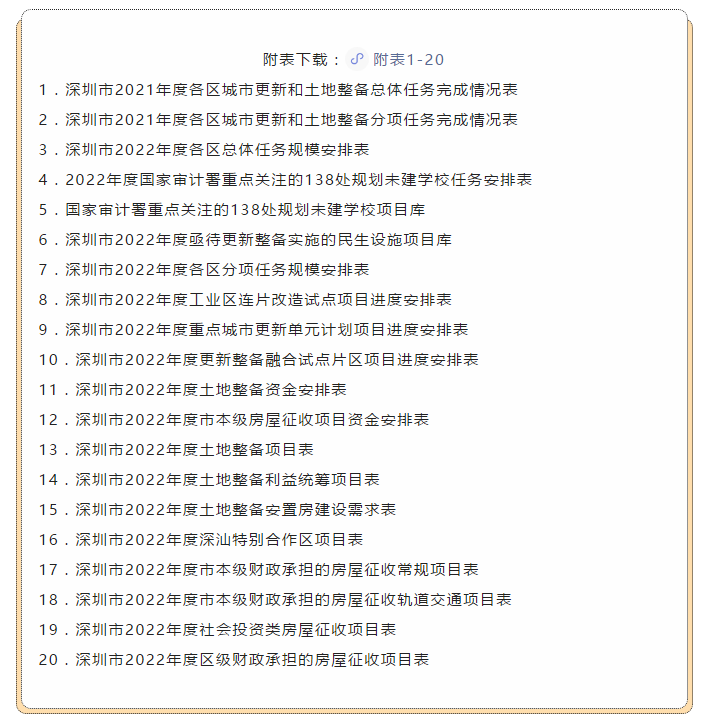 2022年全市通過(guò)城市更新和土地整備實(shí)現(xiàn)用地保障規(guī)模1000公頃,其中,通過(guò)拆除重建類城市更新移交入庫(kù)公共利益用地不少于100公頃,通過(guò)土地整備完成不少于900公頃。