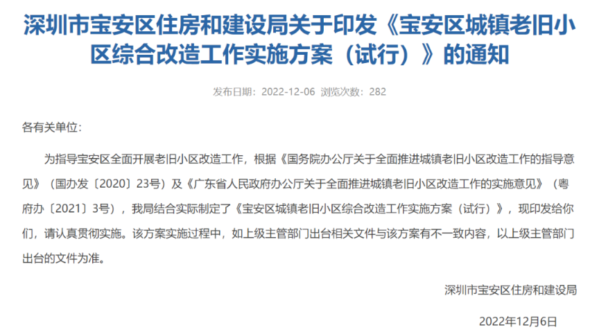【摘要】12月6日,深圳市寶安區(qū)住房和建設(shè)局發(fā)布關(guān)于印發(fā)《寶安區(qū)城鎮(zhèn)老舊小區(qū)綜合改造工作實(shí)施方案(試行)》的通知。