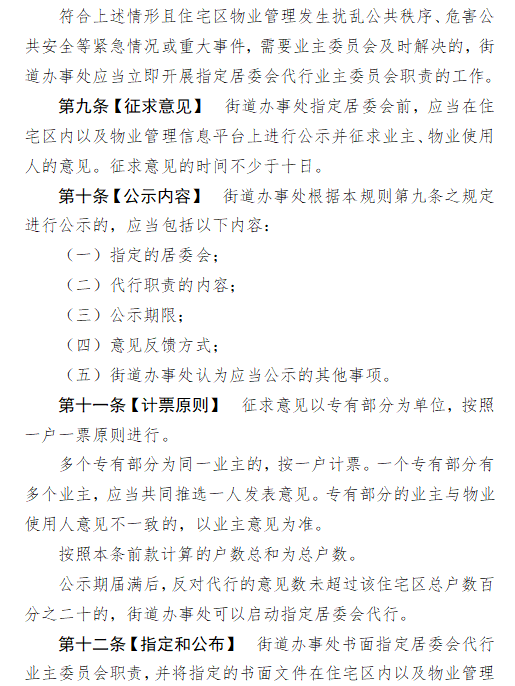 符合上述情形且住宅區(qū)物業(yè)管理發(fā)生擾亂公共秩序、危害公共安全等緊急情況或重大事件,需要業(yè)主委員會(huì)及時(shí)解決的,街道辦事處應(yīng)當(dāng)立即開展指定居委會(huì)代行業(yè)主委員會(huì)職責(zé)的工作。