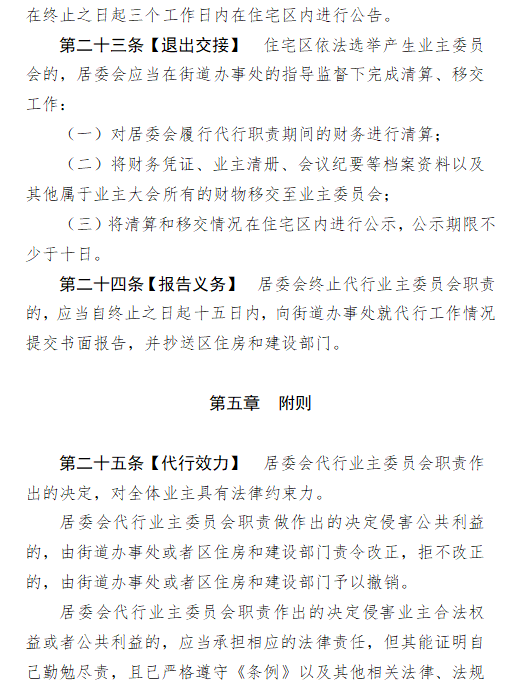 《管理辦法》第五章第二十五條至第三十條對(duì)代行的法律效力、委托專業(yè)服務(wù)、代行期限以及制定示范文本等事項(xiàng)予以了具體規(guī)范。其中第二十七條明確規(guī)定,在代行期間,住宅區(qū)業(yè)主向街道辦事處提請(qǐng)成立首次業(yè)主大會(huì)會(huì)議籌備組或者業(yè)主委員會(huì)換屆小組的,街道辦事處應(yīng)當(dāng)繼續(xù)履行組織成立業(yè)主大會(huì)和選舉業(yè)主委員會(huì)的相關(guān)職責(zé),街道辦事處不得以住宅區(qū)已實(shí)行社區(qū)居民委員會(huì)代行為理由拒絕履行或拖延履行法定義務(wù),體現(xiàn)社區(qū)居民委員會(huì)代行是補(bǔ)充機(jī)制,而非常規(guī)機(jī)制,再次強(qiáng)化了“非必要不代行”的原則。