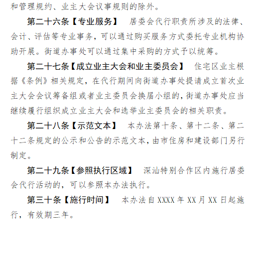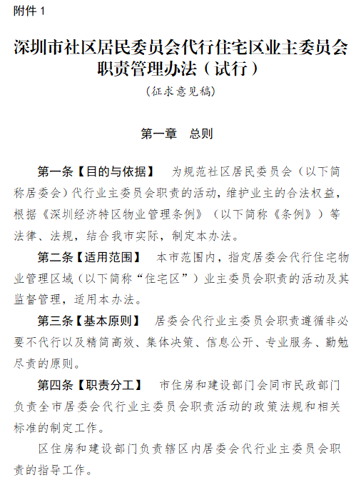 【摘要】2月22日,深圳住建局和深圳民政局聯(lián)合發(fā)布《《深圳市社區(qū)居民委員會(huì)代行住宅區(qū)業(yè)主委員會(huì)職責(zé)管理辦法(試行)(征求意見稿)》,征求意見截止時(shí)間:2022年3月25日。