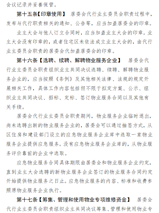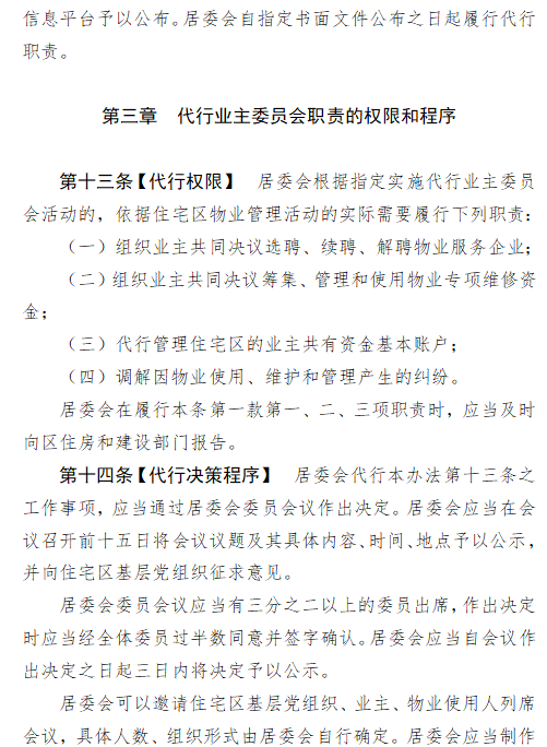 在《條例》第一百二十四條的基礎(chǔ)上,《管理辦法》第三章第十三條對(duì)社區(qū)居民委員會(huì)代行業(yè)主委員會(huì)職責(zé)的權(quán)限予以具體規(guī)范,明確社區(qū)居民委員會(huì)履行業(yè)主委員會(huì)“組織業(yè)主共同決議”“代管業(yè)主共有資金基本賬戶”的主要職能,并在第十六條至第十九條中對(duì)社區(qū)居民委員會(huì)代行業(yè)主委員會(huì)職責(zé)開展選聘、續(xù)聘和解聘物業(yè)服務(wù)企業(yè),籌集、管理和使用物業(yè)專項(xiàng)維修資金以及使用和管理業(yè)主共有資金等活動(dòng)的具體職責(zé)予以細(xì)化。