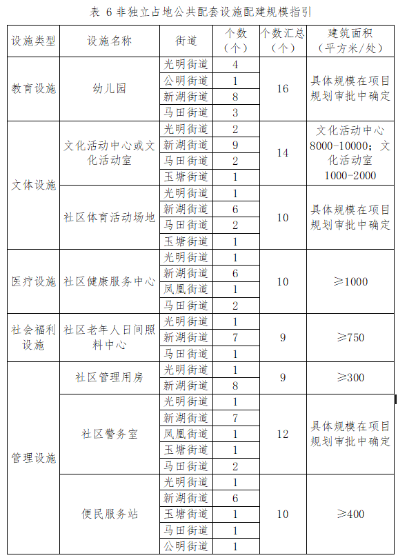 以設施均衡發(fā)展、便民惠民為原則,保障非獨立占地公共配套設施落地,規(guī)劃期內力爭通過城市更新和土地整備規(guī)劃籌集實施非獨立占地公共配套設施90處。包括幼兒園16處、文化活動中心或文化活動室14處,社區(qū)體育活動場地10處、社區(qū)健康服務中心10處、社區(qū)老年人日間照料中心9處、社區(qū)管理用房9處、社區(qū)警務室12處、便民服務站10處。各街道配建規(guī)模如下: