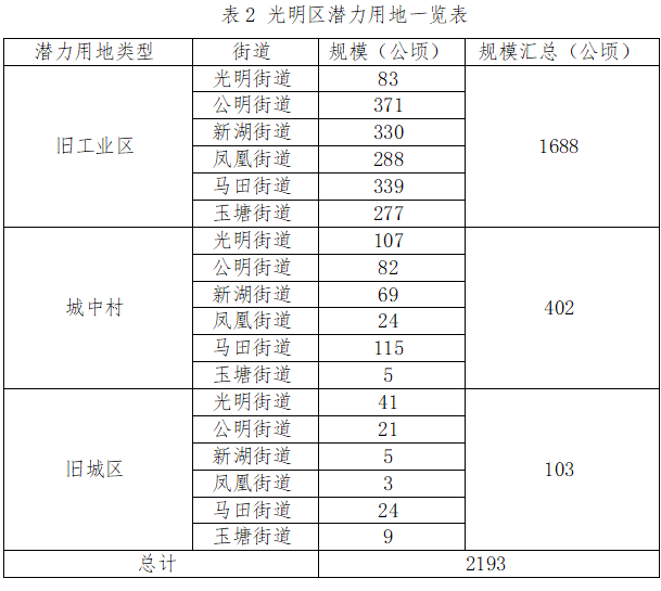 對光明區(qū)城鎮(zhèn)開發(fā)邊界內符合城市更新和土地整備政策要求的低效用地進行梳理和統(tǒng)計,“十四五”期間全區(qū)二次開發(fā)潛力用地為:舊工業(yè)區(qū)1688公頃、城中村402公頃、舊城區(qū)103公頃。