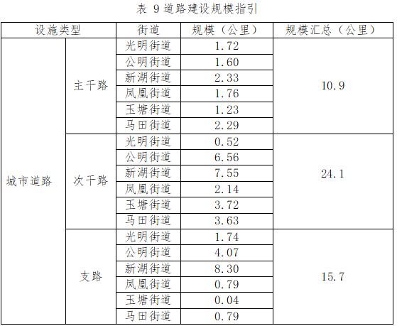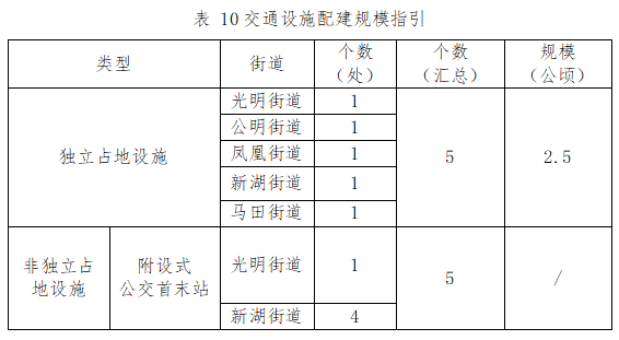以《光明區(qū)國土空間分區(qū)規(guī)劃》、法定圖則、相關專項規(guī)劃為依據,明確“十四五”期間路網優(yōu)化任務和交通設施建設任務。規(guī)劃期內力爭通過城市更新和土地整備落實城市道路50.7公里;力爭規(guī)劃籌集實施獨立占地的交通設施用地不少于5處,占地規(guī)模不少于2.5公頃;非獨立占地的交通設施不少于5處,各類二次開發(fā)項目需根據《大型建筑公交場站配建指引(修訂)》的有關要求配套建設公交首末站。各街道配建規(guī)模如下: