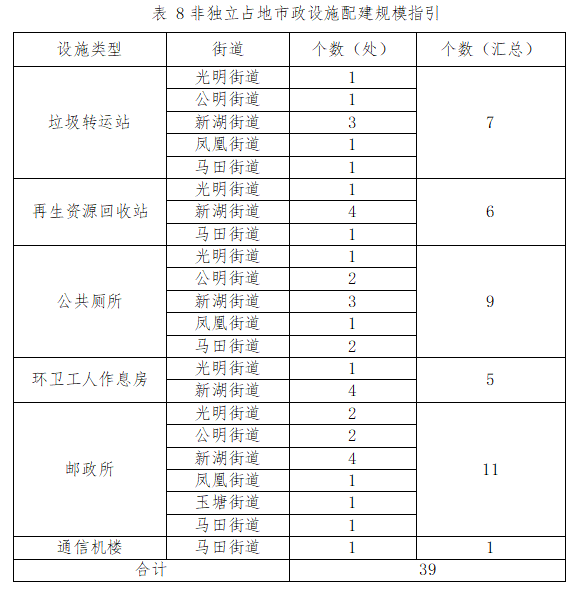 以設施均衡發(fā)展、提升承載能力為原則,保障非獨立占地市政設施落地,規(guī)劃期內力爭通過城市更新和土地整備規(guī)劃籌集實施非獨立占地的市政基礎設施不少于39處。包括垃圾轉運站7處、再生資源回收站6處,公共廁所9處,環(huán)衛(wèi)工人作息房5處,郵政所11處,通信機樓1處。各街道配建規(guī)模如下:
