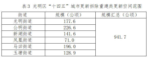 本規(guī)劃結合《深圳市城市更新和土地整備“十四五”規(guī)劃》確定的目標規(guī)模和城市更新拆除重建空間范圍劃定指引,基于光明區(qū)“十四五”二次開發(fā)目標策略,以全區(qū)二次開發(fā)潛力用地為基礎,劃定光明區(qū)“十四五”城市更新拆除重建類更新空間范圍共941.7公頃。