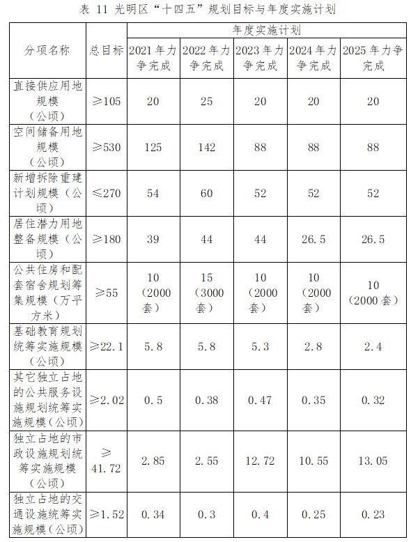 2、城市更新和土地整備實施規(guī)模不少于10.55平方公里,包括完成綜合整治用地不少于4.2平方公里、直接供應用地1.05平方公里、空間儲備用地5.3平方公里。規(guī)劃期內要加快城市更新和土地整備融合,逐步完善光明區(qū)城市更新和土地整備目標任務指標之間的互動調整機制。