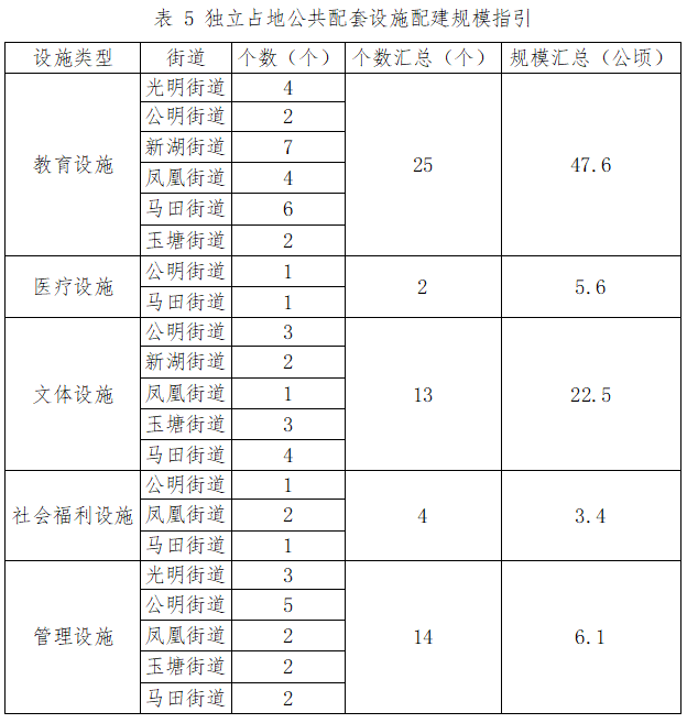結合《光明區(qū)國土空間分區(qū)規(guī)劃》、法定圖則、相關專項規(guī)劃及二次開發(fā)潛力,建立光明區(qū)“十四五”期間通過城市更新和土地整備落實公共服務設施的項目清單,統(tǒng)籌兼顧,突出重點,彌補短板,優(yōu)化配置,明確考核任務規(guī)模。規(guī)劃期力爭通過城市更新和土地整備規(guī)劃籌集實施教育設施用地不少于25處,占地規(guī)模不少于47.6公頃(其中基礎教育設施用地不少于24處,占地規(guī)模不少于46.8公頃,提供學位數不少于4.9萬個;高中用地不少于1處,占地規(guī)模不少于0.77公頃);文體設施用地不少于13處,占地規(guī)模不少于22.5公頃;醫(yī)療設施用地不少于2處,占地規(guī)模不少于5.6公頃;其它獨立占地設施用地不少于18處,占地規(guī)模不少于9.5公頃。各街道配建規(guī)模如下: