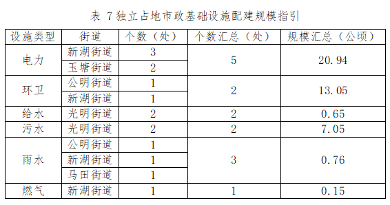 規(guī)劃期內力爭通過城市更新和土地整備規(guī)劃籌集實施獨立占地的市政基礎設施不少于15處,占地規(guī)模不少于42.6公頃,其中電力工程設施5處、環(huán)衛(wèi)工程設施2處、給水工程設施2處、污水工程設施2處、雨水工程設施3處、燃氣工程設施1處。各街道配建規(guī)模如下: