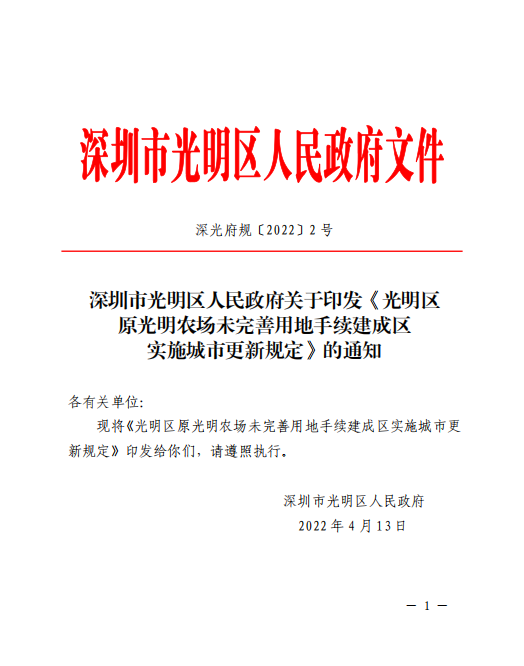 【摘要】4月13日,深圳市光明區(qū)人民政府發(fā)布了《光明區(qū)原光明農(nóng)場(chǎng)未完善用地手續(xù)建成區(qū)實(shí)施城市更新規(guī)定》的通知。