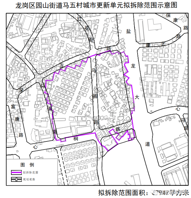 項目位于深圳市位于龍崗區(qū)園山街道,項目擬拆除重建范圍面積為67947㎡,擬更新方向為居住、商業(yè)等功能。擬拆除范圍內(nèi)應(yīng)落實不少于27班九年一貫制學(xué)校一所,落實用地不少于2895平方米的公共綠地,總計落實不少于26503平方米的公共利益用地。在更新單元規(guī)劃階段按規(guī)定落實馬五羅氏老圍的保護要求。