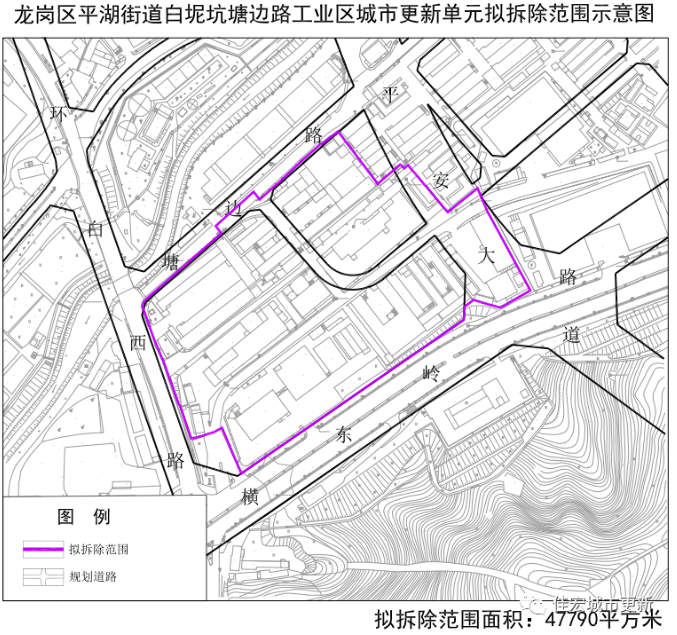 白坭坑塘邊路工業(yè)區(qū)更新單元位于平湖街道,橫東嶺路與東深路交匯處東北側(cè)。擬拆除重建用地面積47790㎡,拆除重建范圍內(nèi)應(yīng)落實不少于7925㎡的公共利益用地,貢獻率達16%,更新方向為普通工業(yè)、新型產(chǎn)業(yè)功能。