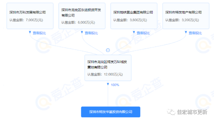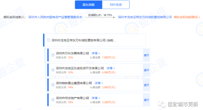 經(jīng)工商信息查詢,深圳市特發(fā)華基投資有限公司四大股東為:萬科(35%)、龍崗區(qū)東進(jìn)投資有限公司(30%)、地鐵置業(yè)集團(tuán)(19%)、特發(fā)地產(chǎn)(16%)。