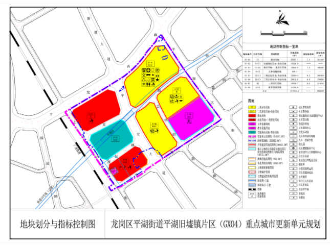 根據(jù)《龍崗區(qū)平湖街道平湖舊墟鎮(zhèn)片區(qū)(GX04)重點(diǎn)城市更新單元規(guī)劃》(深龍府函〔2021〕7 號(hào),見附件一),本項(xiàng)目主要經(jīng)濟(jì)技術(shù)指標(biāo)具體如下:更新單元用地面積216387.5平方米,拆除范圍用地面積202082.9平方米,開發(fā)建設(shè)用地面積106622.3平方米,其中 3000平方米國有未出讓的零星用地按照城市更新辦法及實(shí)施細(xì)則一并出讓給項(xiàng)目實(shí)施主體。規(guī)劃計(jì)容積率建筑面積862230平方米,其中住宅 463000 平方米(含安居型商品房 68696 平方米,公共租賃住房 17174 平方米),商業(yè)、辦公及旅館業(yè)建筑336930平方米,地下商業(yè)29470平方米,公共配套設(shè)施(含地下)32830平方米。另配建社區(qū)體育活動(dòng)場(chǎng)地占地面積4500平方米。