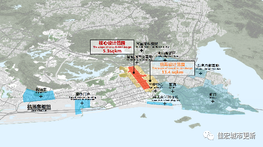核心研究范圍:面積約為 5.3 平方公里,西南起新湖路,東北至留仙三路,沿創(chuàng)業(yè)路兩側(cè)約 500 米范圍的帶狀區(qū)域。