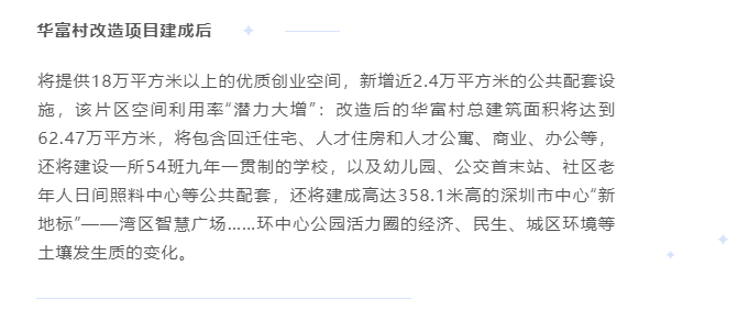改造后的華富村,與中心公園無(wú)縫鏈接,作為粵港澳大灣區(qū)“未來(lái)城市新標(biāo)桿”,將被打造成為“深圳中心未來(lái)家園城市新標(biāo)桿”,達(dá)到國(guó)內(nèi)頂級(jí)新型宜居住宅區(qū)。