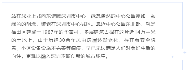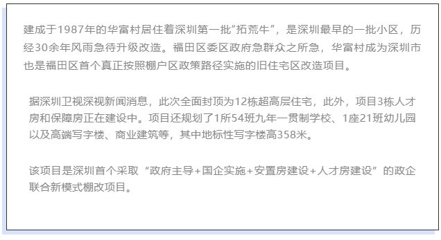 華富村居民期盼小區(qū)品質(zhì)早日改善。2018年6月,深圳市委市政府印發(fā)了《深圳市人民政府關(guān)于加強(qiáng)棚戶(hù)區(qū)改造工作的實(shí)施意見(jiàn)》,提出“政府主導(dǎo)+企業(yè)參與+安置房建設(shè)+人才房建設(shè)”的棚改新模式。