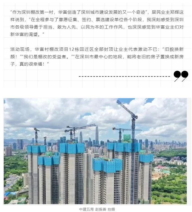 今天,在“黨建引領(lǐng)保安全,共建攻堅(jiān)促生產(chǎn)”—華富村棚改項(xiàng)目全面封頂暨攻堅(jiān)誓師大會(huì)上,隨著華富村東、西區(qū)12棟回遷區(qū)最后一棟主體結(jié)構(gòu)6號(hào)樓封頂,親眼見(jiàn)證深圳老舊住宅小區(qū)“棚改第一村”12棟回遷區(qū)全部封頂,業(yè)主代表很感慨:“非常開(kāi)心!親眼見(jiàn)證新家園‘拔地而起’,特別讓人激動(dòng)。”