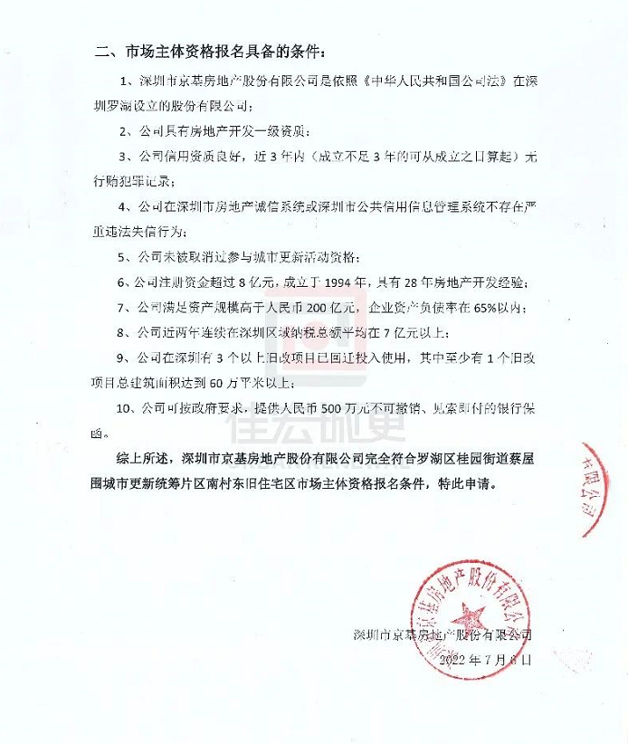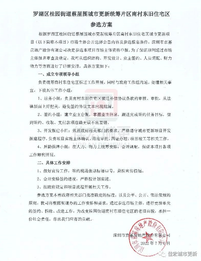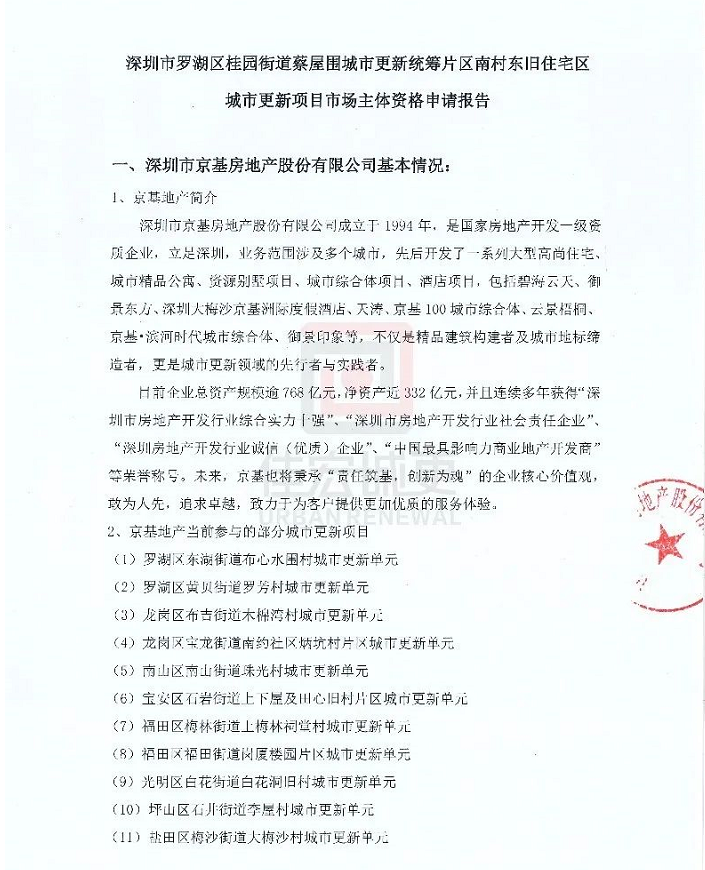 【摘要】近日,深圳市羅湖區(qū)桂園街道辦事處發(fā)布“蔡屋圍城市更新統(tǒng)籌片區(qū)南村東舊住宅區(qū)城市更新項(xiàng)目候選市場(chǎng)主體名單公告”,深圳市京基房地產(chǎn)股份有限公司列入該項(xiàng)目候選市場(chǎng)主體名單。