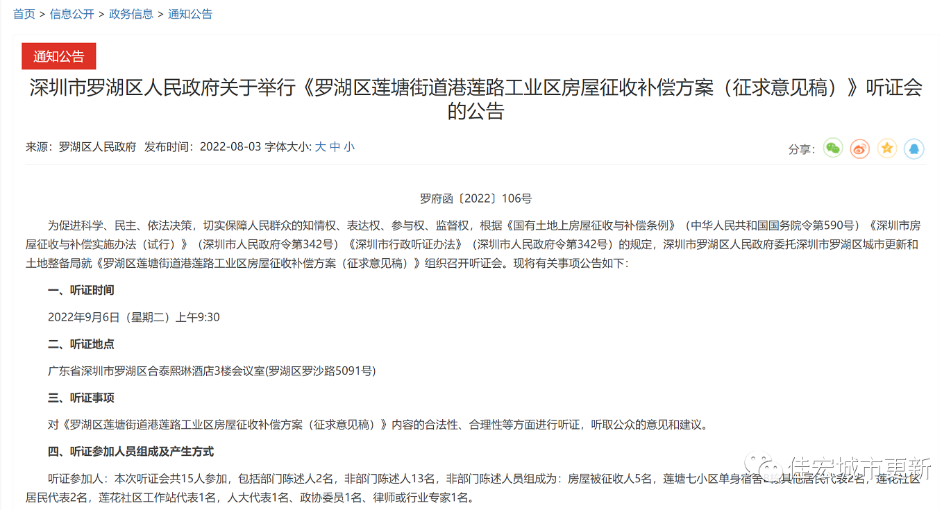 【摘要】2022年8月3日,深圳市羅湖區(qū)人民政府發(fā)布關(guān)于舉行《羅湖區(qū)蓮塘街道港蓮路工業(yè)區(qū)房屋征收補(bǔ)償方案(征求意見稿)》聽證會(huì)的公告。