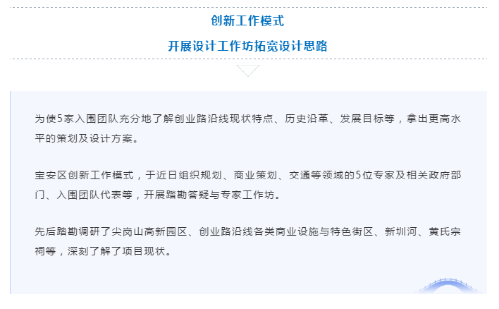 寶安創(chuàng)業(yè)路商務(wù)大道策劃及城市設(shè)計(jì)國(guó)際咨詢專家工作坊研討會(huì)順利召開,五家具有國(guó)際視野的知名設(shè)計(jì)團(tuán)隊(duì)和行業(yè)頂尖專家齊聚寶安,共同謀劃“對(duì)話世界、國(guó)際一流、灣區(qū)標(biāo)桿”的寶安“第五大道”。