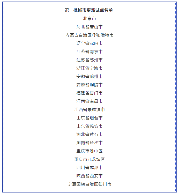 為貫徹落實(shí)黨的十九屆五中全會(huì)精神,完整、準(zhǔn)確、全面貫徹新發(fā)展理念,積極穩(wěn)妥實(shí)施城市更新行動(dòng),引領(lǐng)各城市轉(zhuǎn)型發(fā)展、高質(zhì)量發(fā)展,在各地推薦基礎(chǔ)上,經(jīng)遴選,決定在北京等21個(gè)城市(區(qū))開(kāi)展第一批城市更新試點(diǎn)工作?,F(xiàn)將有關(guān)事項(xiàng)通知如下: